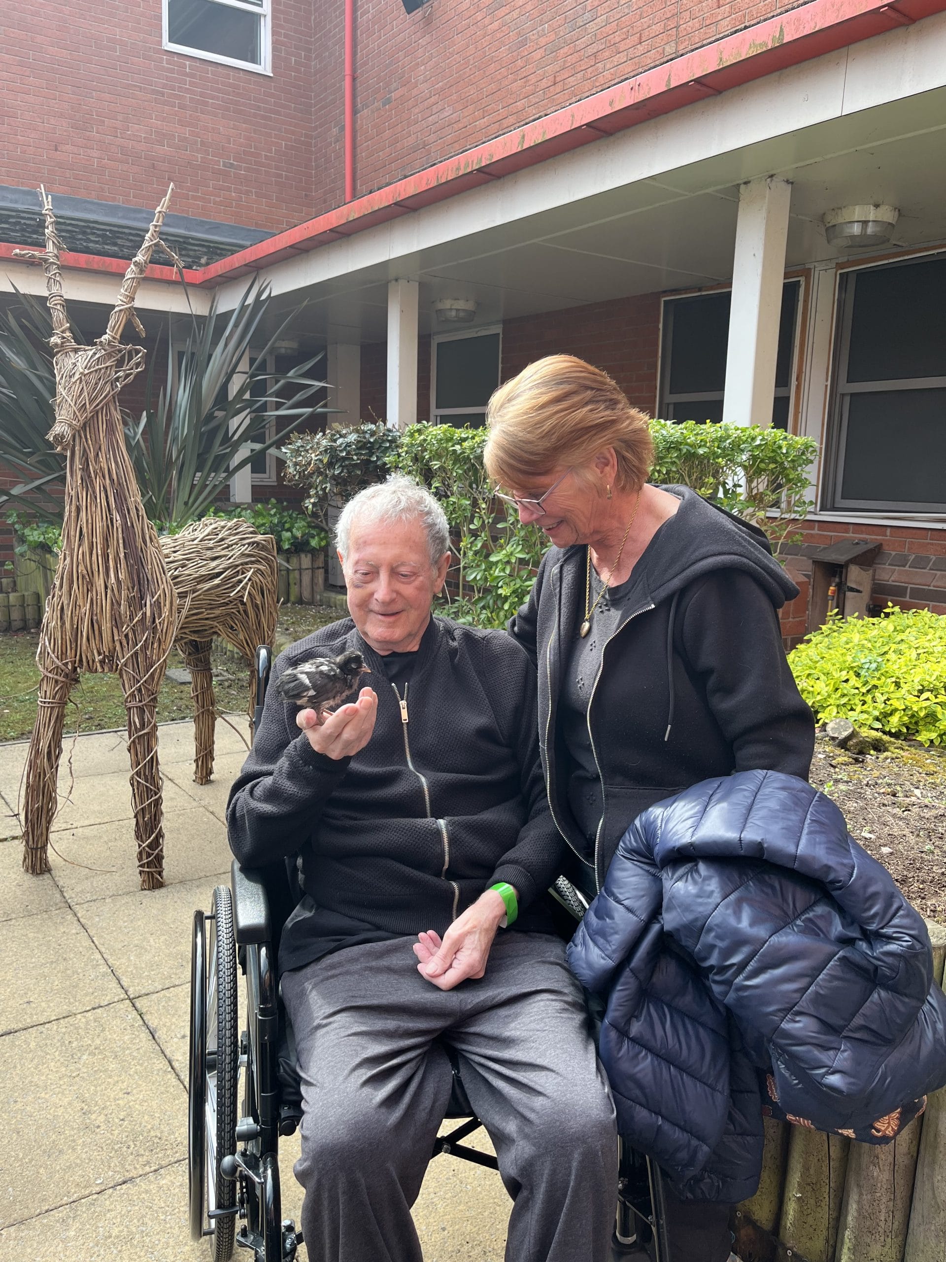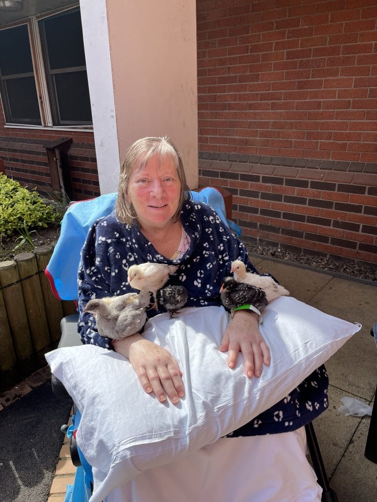 Jayne*, a patient on Ward 3, shared a touching comment with our team on how far her rehabilitation journey had come, going from having no movement in her arms, to now stroking a baby chick. Kim told us about Jayne’s rehabilitation, saying ” Jayne had no movement in her arms when she first came to us. With a lot of upper limb exercises, stretches and using the Syrebo Rehabilitation Robot Glove, which was funded by the charity, she now has movement in her arms. “.